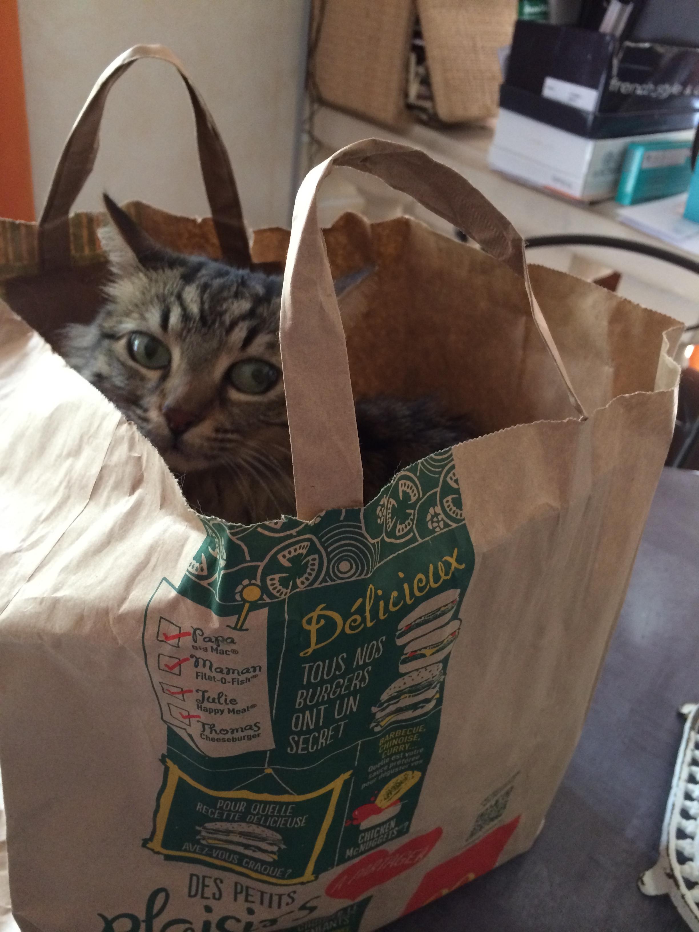 Je ne sais pas pourquoi, mais les chats adorent les sacs. Un jour, mon chat a voulu rentrer dans mon sac d’école.