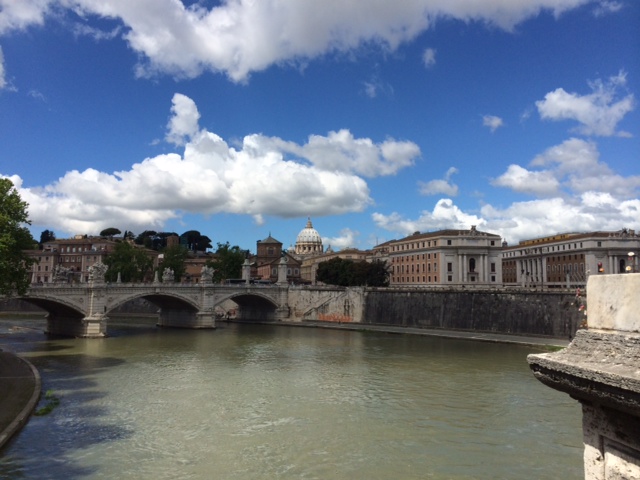 Vue sur la coupole de l’église St. Pierre (au milieu au fond) et sur le Tibre
