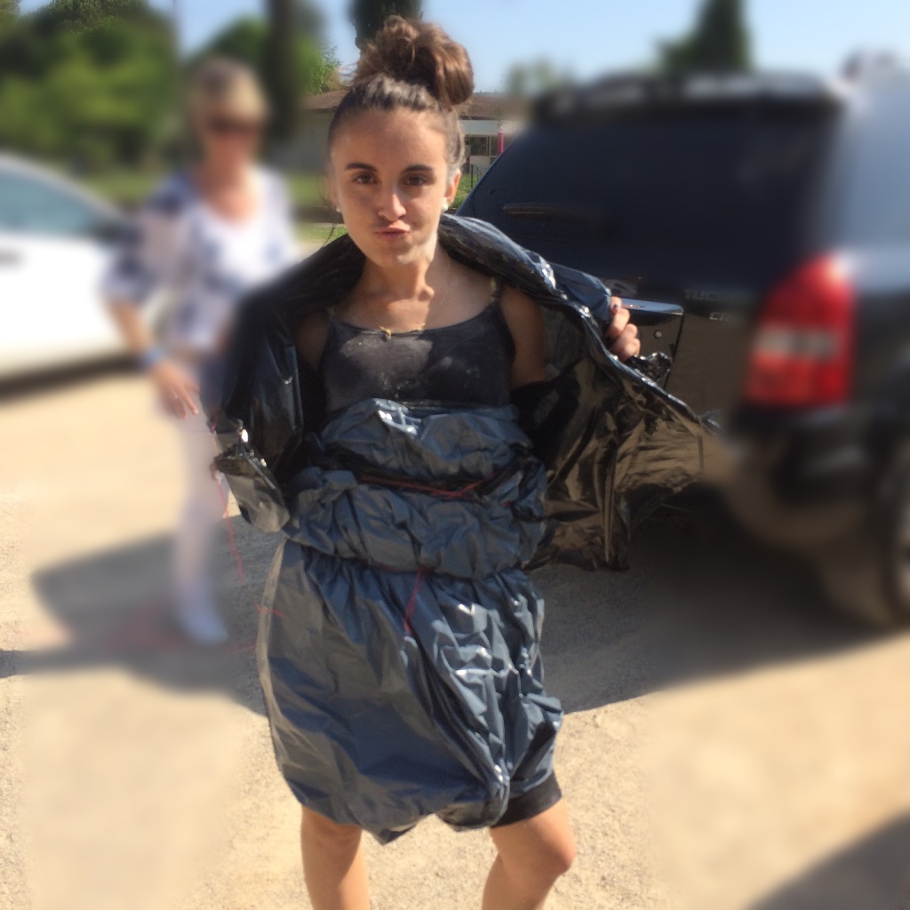 Un rien l’habille… 3 sacs poubelles et la voilà prête à défiler!!! Ses amis au collège, lui ont fait une surprise à la sortie du collège: sauce tomate, farine, yaourt &co… Il n’était pas question de la mettre dans ma citrouille dans cet état! Alors merci Handy Bag!