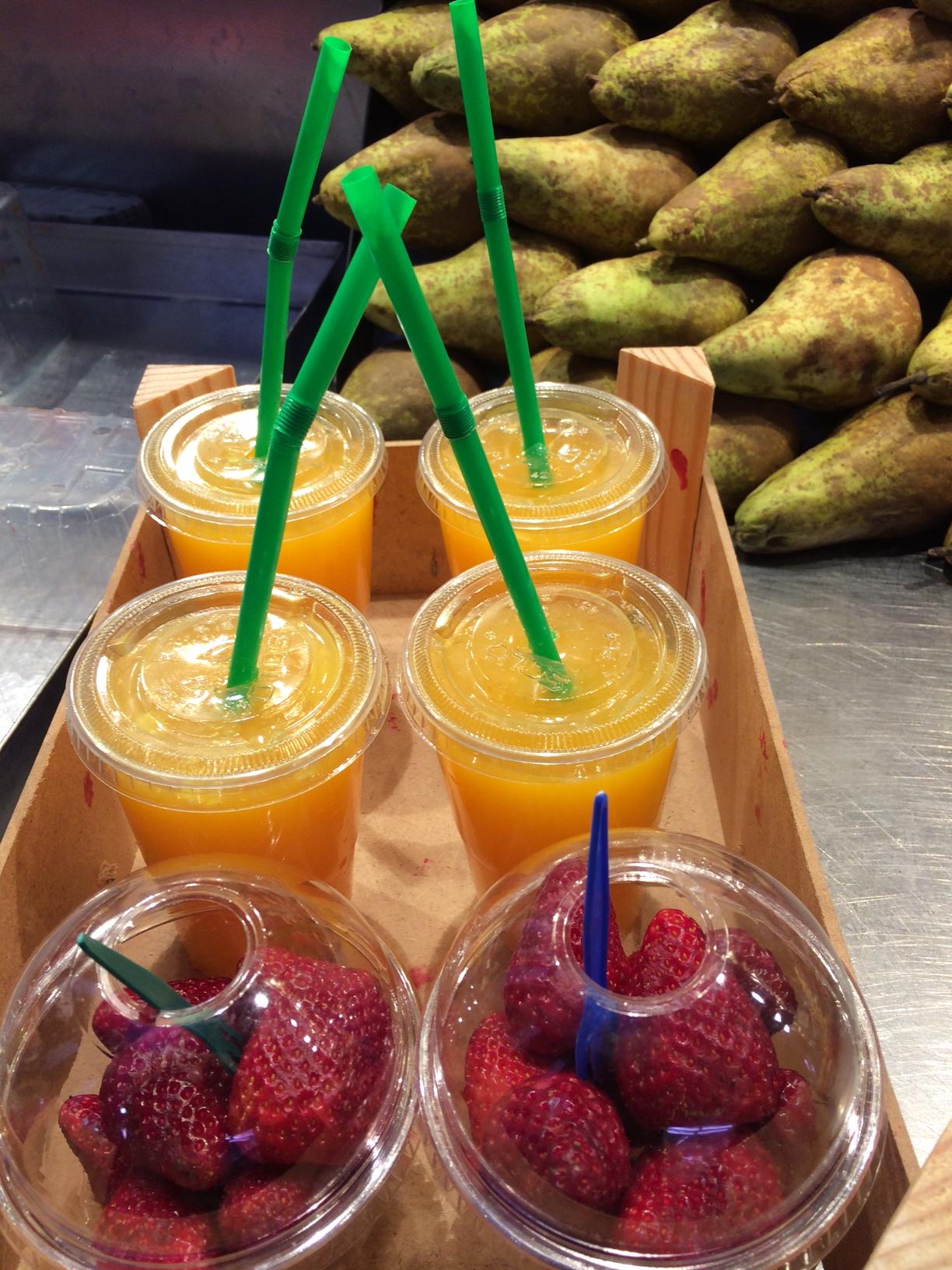 J’ai craqué… Impossible de résister à un bon jus d’orange frais et à quelques fraises!