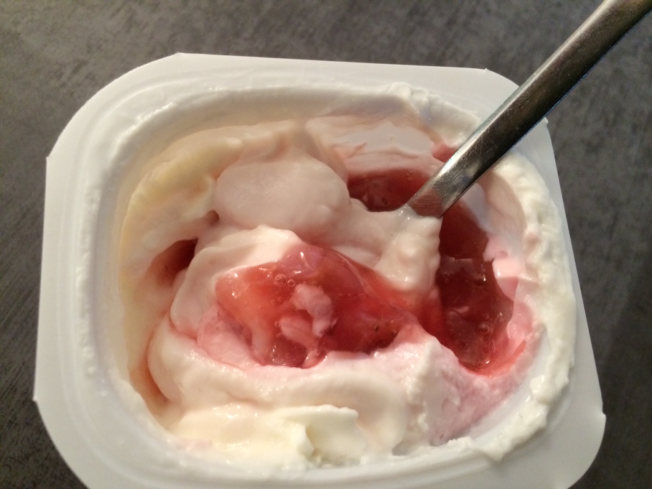 Un fromage blanc un peu compact a mélanger avec un coulis (fraises ici)