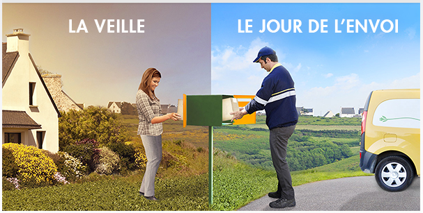 Selon les conditions d’éligibilité indiquées sur le site, vous préparez votre colis… Vous affranchissez en ligne… Vous mettez votre colis dans votre boîte à lettres, et le lendemain votre facteur le récupère, vous laisse une preuve de retrait du colis… Et voilou!!!