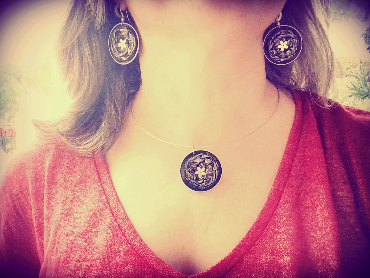 Quand on ne sait pas quoi mettre comme parure boucle d’oreilles et pendentif… Eh bien on s’en fait une rapido…